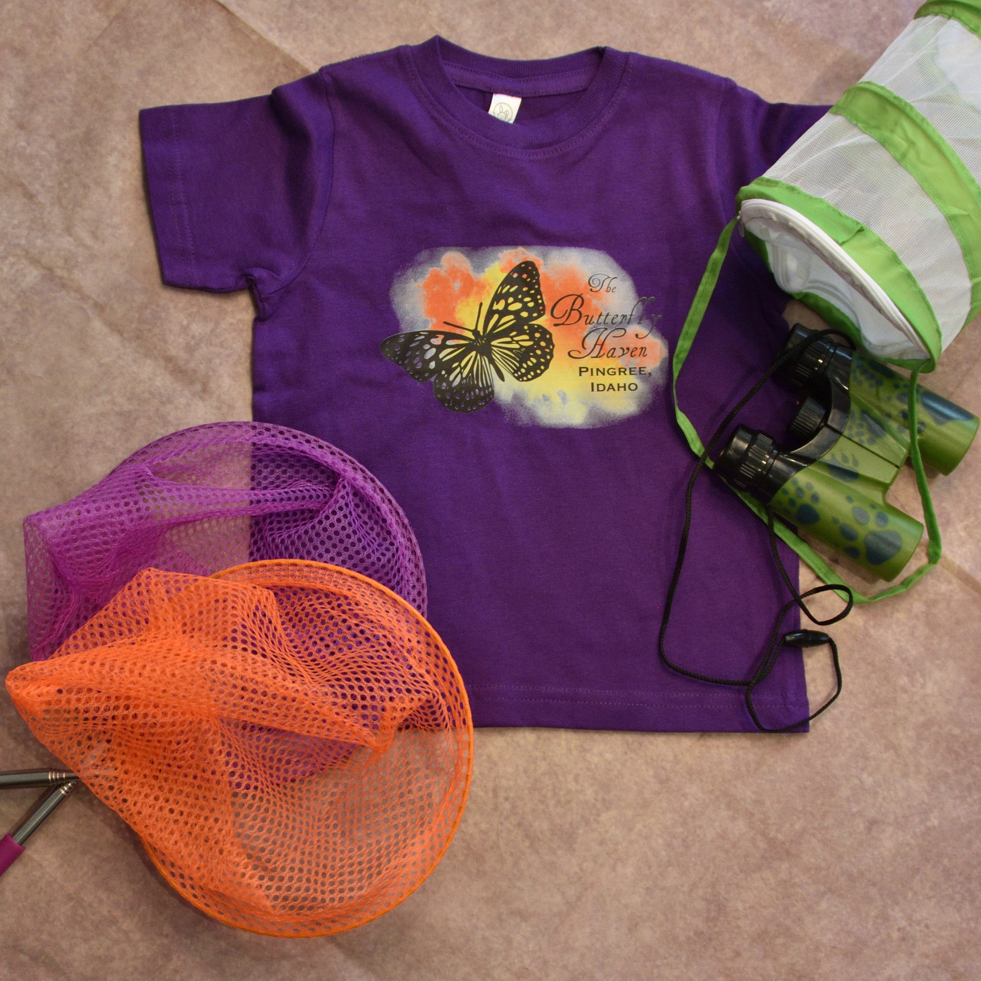 Rabbit Skin Toddler Tshirt. Splash of orange and Yellow with a butterfly on top. Base color is either purple or trade wind blue